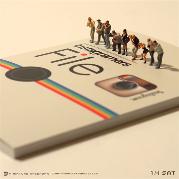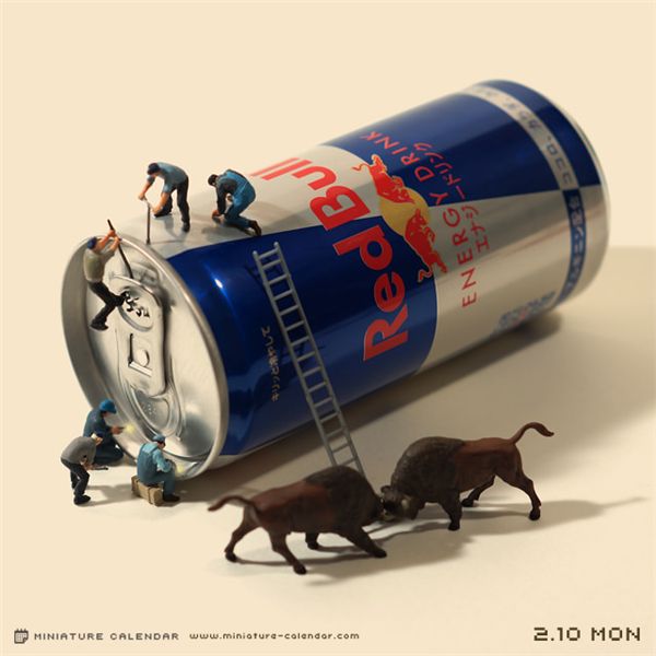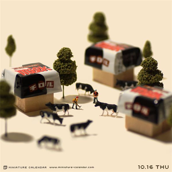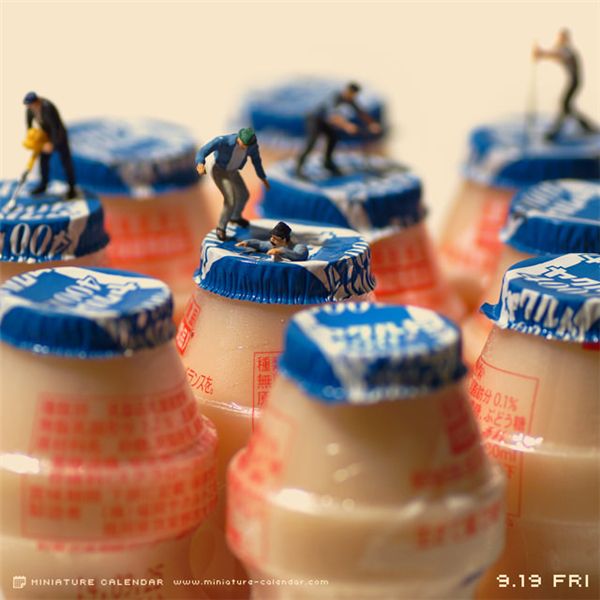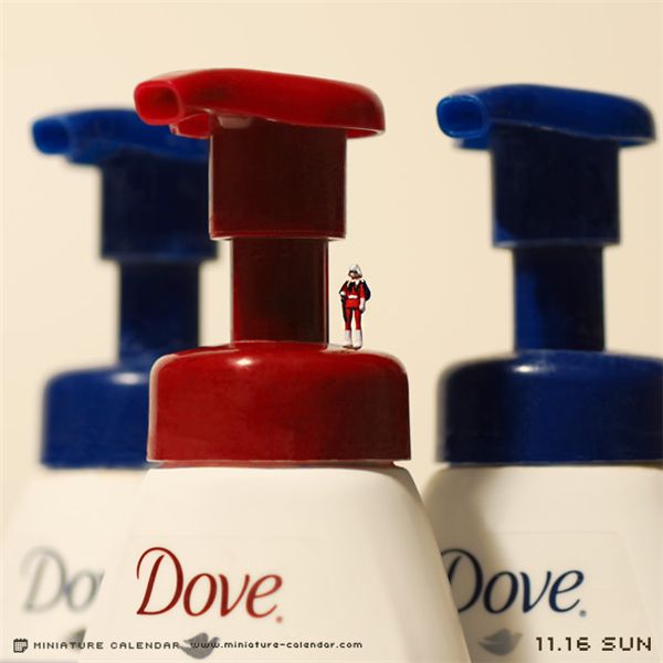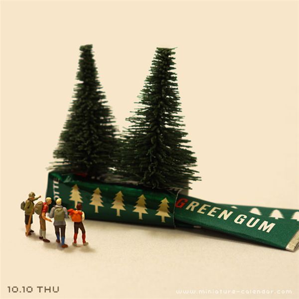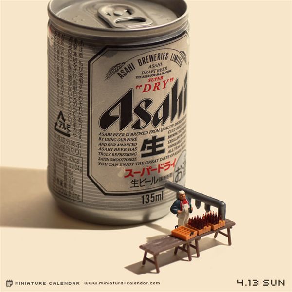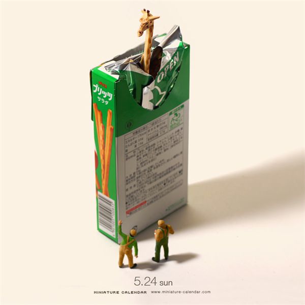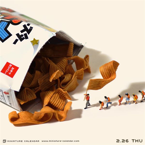 在这本日历中,达也田中每天都会创作一些新作品,并将之作为日期的背景图。而这些作品中的主角,却是我们生活中常常会接触到,但很少会特别关注的一些小东西。比如薯片、洗碗巾、吸管、酒瓶盖、打火机等等等,而这些原本并不起眼的小道具,此时却成了我们的另一番天地。达也田中将人类缩小了好多倍,并创造性的为之匹配最恰当的造型,将自己捏的这些微型人物,合情合理的置身到场景之中,缔造了另一个妙趣的世界。